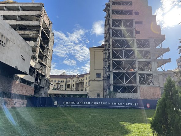 Walking through Belgrade is walking throughits history. On the picture one can see the memorial-like ruins of houses that were bombed in 1999 by NATO forces. The banner reads: “министарство одбране и војска србије”, meaning: “Ministry of Defense and the Army of Serbia”.